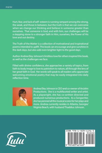Hurt, fear, and lack of self- esteem is running rampant among the strong, the weak, and those in between but the truth is that we can overcome when we change our thinking and believe in someone greater than ourselves. That someone is God, and with him, our challenges will be a stepping stone to a stronger faith in Him, ourselves the power of His love and out destiny. The Truth of the Matter is a collection of motivational and inspirational poems intended to uplift. This book can encourage and give sunshine in the dark days, but also add even brighter light to the good days. Author Andrea Eley Johnson's limitless love for others inspired this book, as well as the challenges we face. Filled with divine confidence, she approaches a variety of topics, from faith to body image to love to patriotism to nature, all through the lens of her great faith in God. Her words will speak to all readers who appreciate welcoming emotional poetry that may be easily integrated into daily reflection time.