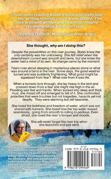 "I did not die on the river. I lived." She thought, why am I doing this? Despite the possibilities on this river journey, Bobbi knew the only certainty was her unknowing. She felt relief when the downstream current was smooth and tame, but she knew the water had a mind of its own. Its change came by the moment. Fears rose about sleeping in mysterious places alone or what was around a bend in the river. Some days, the good weather turned and was suddenly frightening. What good might be squeezed from fear? What rose from it was life. When a tornado tore through, she lay heavy in the tent and pressed down from a fear she might rise high in the air. Flooding was fast and frantic. When sucked into deep and thick mud, she rinsed off and emerged to tell of it. She confronted polarities that were troubles but not tragedies, hazards yet not deadly. They were alarming but still bearable. She loved the boldness and freedom of water, which was not shared with humans. She loved how the top water moved seamlessly, going from smooth to rolling to perilous. Even afraid, she loved the river's temper and moods. She will never forget the river trip when she launched and just went. Bobbi Rathert lives in the Midwest. She worked in clinical mental health in Chicago for twenty-five years and on her sheep farm in southwest Wisconsin for twenty years. She solo kayaked six hundred and fifty miles of the Mississippi River at sixty-eight and then retired. She writes stories of the river and her many other life adventures.