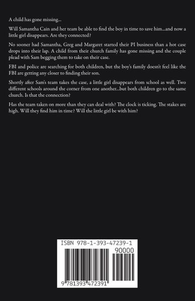 A child has gone missing... Will Samantha Cain and her team be able to find the boy in time to save him...and now a little girl disappears. Are they connected? No sooner had Samantha, Greg and Margaret started their PI business than a hot case drops into their lap. A child from their church family has gone missing and the couple plead with Sam begging them to take on their case. FBI and police are searching for both children, but the boy's family doesn't feel like the FBI are getting any closer to finding their son. Shortly after Sam's team takes the case, a little girl disappears from school as well. Two different schools around the corner from one another...but both children go to the same church. Is that the connection? Has the team taken on more than they can deal with? The clock is ticking. The stakes are high. Will they find him in time? Will the little girl be with him?
