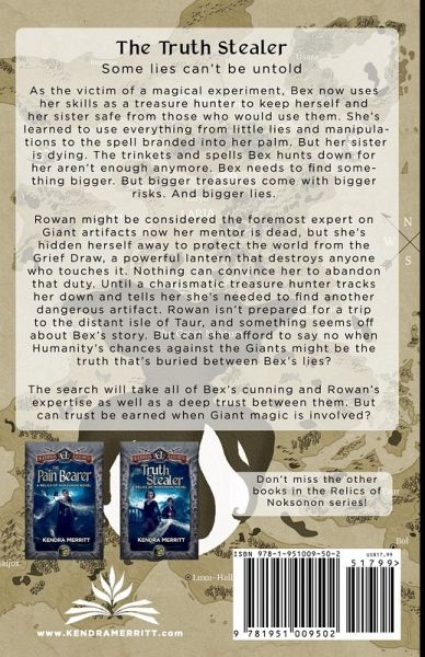 Some lies can't be untold. As the victim of a magical experiment, Bex now uses her skills as a treasure hunter to keep herself and her sister safe from those who would use them. She's learned to use everything from little lies and manipulations to the spell branded into her palm. But her sister is dying. The trinkets and spells Bex hunts down for her aren't enough anymore. Bex needs to find something bigger. But bigger treasures come with bigger risks. And bigger lies. Rowan might be considered the foremost expert on Giant artifacts now her mentor is dead, but she's hidden herself away to protect the world from the Grief Draw, a powerful lantern that destroys anyone who touches it. Nothing can convince her to abandon that duty. Until a charismatic treasure hunter tracks her down and tells her she's needed to find another dangerous artifact. Rowan isn't prepared for a trip to the distant isle of Taur, and something seems off about Bex's story. But can she afford to say no when Humanity's chances against the Giants might be the truth between Bex's lies? The search will take all of Bex's cunning and Rowan's expertise as well as a deep trust between them. But can trust be earned when Giant magic is involved?