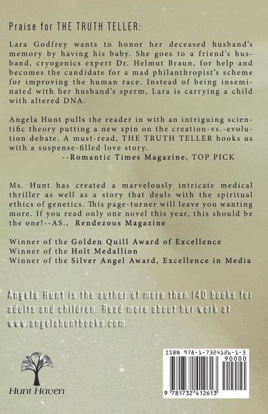 Lara Godfrey wants to honor her deceased husband's memory by having his baby. She goes to a friend's husband, cryogenics expert Dr. Helmut Braun, for help and becomes the candidate for a mad philanthropist's scheme for improving the human race. Instead of being inseminated with her husband's sperm, Lara is carrying a child with altered DNA. Angela Hunt pulls the reader in with an intriguing scientific theory putting a new spin on the creation-vs.-evolution debate. A must-read, THE TRUTH TELLER hooks us with a suspense-filled love story. --Romantic Times Magazine, TOP PICK Ms. Hunt has created a marvelously intricate medical thriller as well as a story that deals with the spiritual ethics of genetics. This page-turner will leave you wanting more. If you read only one novel this year, this should be the one!--AS., Rendezous Magazine Winner of the Golden Quill Award of Excellence Winner of the Holt Medallion Winner of the Silver Angel Award, Excellence in Media