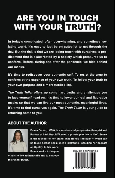 ARE YOU IN TOUCH WITH YOUR TRUTH? In today's complicated, often overwhelming, and sometimes isolating world, it's easy to just be on autopilot to get through the day. But the risk is that we are losing touch with ourselves, a predicament that is exacerbated by a society which pressures us to conform. Before, during and after the pandemic, we hide behind our masks. It's time to rediscover your authentic self. To resist the urge to conform at the expense of your own truth. To follow your truth to your own purpose and a more fulfilled life. The Truth Teller offers up some hard truths and challenges you to face yourself head on. It's time to lower our real and figurative masks so that we can live our most authentic, meaningful lives. It's time to find ourselves again. The Truth Teller is your guide to returning home to you.