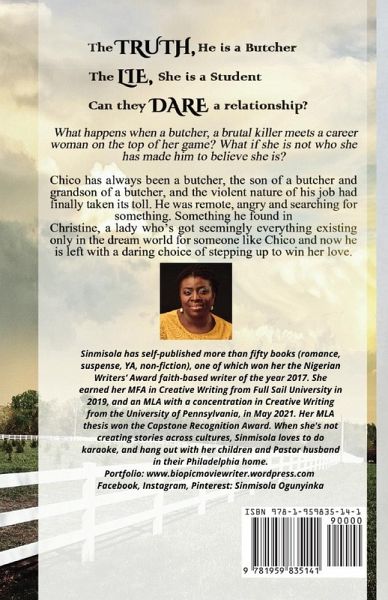 The truth, he is a butcher. The lie, she is a student. Can they dare a relationship? What happens when a butcher, a brutal killer, meets a career woman on top of her game? What if she is not who she has made him believe she is? Chico has always been a butcher, the son of a butcher and the grandson of a butcher, and the violent nature of his job had finally taken its toll. He is remote, angry, and searching for something. Something he finds in Christine, a lady who's got seemingly everything existing only in Chico's dream world. Christine Bello presents as the perfect career woman from a rich and influential family but her relationship choices all seem to be wrong. Even Chico Ode turns out to be from a different class her family would not accept. Torn between her job, family, church, and the truth, Christine dares to fall in love but she's not the only one with a lie, and shadows in her life. As the reality of their choices unfolds, Chico is forced to answer many questions of his own or forfeit the opportunity to have his dreams come true.