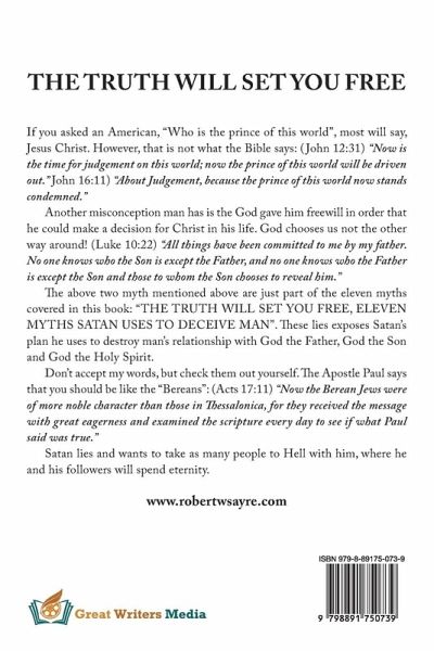 If you asked an American, "Who is the prince of this world", most will say, Jesus Christ. However, that is not what the Bible says: (John 12:31) "Now is the time for judgement on this world; now the prince of this world will be driven out." John 16:11) "About Judgement, because the prince of this world now stands condemned." Another misconception man has is the God gave him freewill in order that he could make a decision for Christ in his life. God chooses us not the other way around! (Luke 10:22) "All things have been committed to me by my father. No one knows who the Son is except the Father, and no one knows who the Father is except the Son and those to whom the Son chooses to reveal him." The above two myth mentioned above are just part of the eleven myths covered in this book: "THE TRUTH WILL SET YOU FREE, ELEVEN MYTHS SATAN USES TO DECEIVE MAN". These lies exposes Satan's plan he uses to destroy man's relationship with God the Father, God the Son and God the Holy Spirit. Don't accept my words, but check them out yourself. The Apostle Paul says that you should be like the "Bereans": (Acts 17:11) "Now the Berean Jews were of more noble character than those in Thessalonica, for they received the message with great eagerness and examined the scripture every day to see if what Paul said was true." Satan lies and wants to take as many people to Hell with him, where he and his followers will spend eternity. ¿¿www.robertwsayre.com