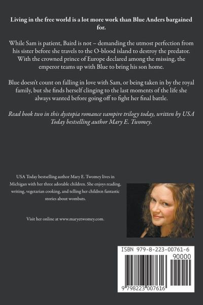 Living in the free world is a lot more work than Blue Anders bargained for. While Sam is patient, Baird is not - demanding the utmost perfection from his sister before she travels to the O-blood island to destroy the predator. With the crowned prince of Europe declared among the missing, the emperor teams up with Blue to bring his son home. Blue doesn't count on falling in love with Sam, or being taken in by the royal family, but she finds herself clinging to the last moments of the life she always wanted before going off to fight her final battle. Read book two in this dystopia romance vampire trilogy today, written by USA Today bestselling author Mary E. Twomey.