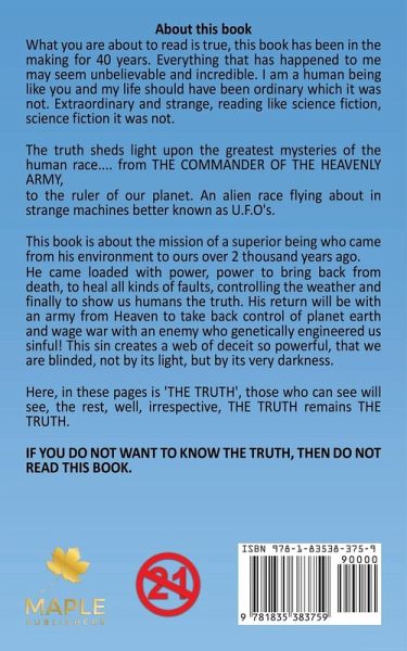 What you are about to read is true, this book has been in the making for 40 years. Everything that has happened to me may seem unbelievable and incredible. I am a human being like you and my life should have been ordinary which it was not. Extraordinary and strange, reading like science fiction, science fiction it was not. The truth sheds light upon the greatest mysteries of the human race.... from THE COMMANDER OF THE HEAVENLY ARMY, to the ruler of our planet. An alien race flying about in strange machines better known as U.F.O's. This book is about the mission of a superior being who came from his environment to ours over 2 thousand years ago. He came loaded with power, power to bring back from death, to heal all kinds of faults, controlling the weather and finally to show us humans the truth. His return will be with an army from Heaven to take back control of planet earth and wage war with an enemy who genetically engineered us sinful! This sin creates a web of deceit so powerful, that we are blinded, not by its light, but by its very darkness. Here, in these pages is 'THE TRUTH', those who can see will see, the rest, well, irrespective, THE TRUTH remains THE TRUTH. IF YOU DO NOT WANT TO KNOW THE TRUTH, THEN DO NOT BREAK THE SEAL OF THIS BOOK.