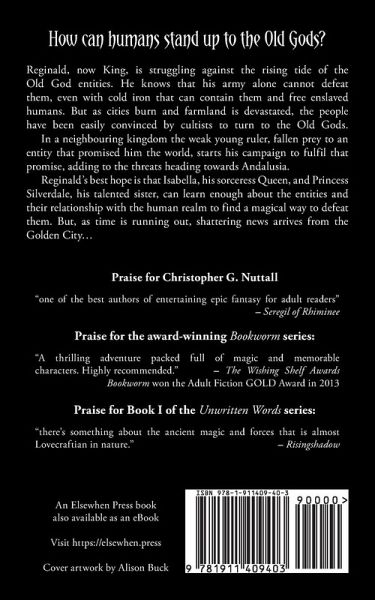 Reginald, now King, is struggling against the rising tide of the Old God entities. He knows that his army alone cannot defeat them, even with cold iron that can contain them and free enslaved humans. But as cities burn and farmland is devastated, the people have been easily convinced by cultists to turn to the Old Gods. In a neighbouring kingdom the weak young ruler, fallen prey to an entity that promised him the world, starts his campaign to fulfil that promise, adding to the threats heading towards Andalusia. Reginald's best hope is that Isabella, his sorceress Queen, and Princess Silverdale, his talented sister, can learn enough about the entities and their relationship with the human realm to find a magical way to defeat them. But, as time is running out, shattering news arrives from the Golden City...