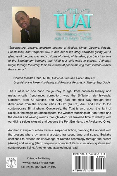The Tuat is on one hand the journey to the light from the darkness literally and metaphorically (ignorance, corruption, war, the S Nation, etc.) Iswande, Netchem, Meri Sa Aunghk and Kling Saa knit their way through time dimension from the ancient cities of Om (Ta Ra), Anu and Uast, to the contemporary Birmingham. Conversely, The Tuat is also about the light of Kalakun, the magic of Bambalasaam, the wisdom teachings of Ptah Hetep between the dream and waking worlds through which these characters traverse time to identify with their divine selves (Ausar) becoming the Pert Em Heru, the Awaken Ones.
