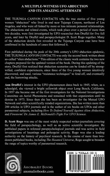 THE TUJUNGA CANYON CONTACTS tells the true stories of five young women "abductees" who lived in and near Tujunga Canyon, northeast of Los Angeles, and who were all linked by more or less intimate personal relationships. The abductions and related events, which took place over a period of more than two decades, were first investigated by UFO researcher Ann Druffel for five full years, and later by Druffel and parapsychologist D. Scott Rogo together. Many of the abduction details first revealed in the Tujunga Canyon case have been confirmed in the hundreds of cases that followed it. First published during the peak of the 20th century's UFO abduction epidemic, THE TUJUNGA CANYON CONTACTS was only the second book written about so-called "alien abductions." This edition of the classic work contains the two new chapters prepared for the updated version of the book. During this updating of the story, Druffel first realized that abduction scenarios can be fended off by strong-willed, confident experiencers, since three of the five young women intuitively discovered, and used, various "resistance techniques" to fend off, and eventually end, the harrowing attacks.