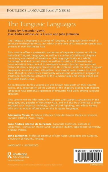 This volume offers a systematic succession of separate chapters on all the individual Tungusic languages, as well as a number of additional chapters containing contextual information on the language family as a whole, its background and current state, as well as its history of research and documentation. Manchu and its mediaeval ancestor Jurchen are important historical literary languages discussed in this volume, while the other Tungusic languages, around a dozen altogether, have always been spoken by small, local, though in some cases territorially widespread, populations engaged in traditional subsistence activities of the Eurasian taiga and steppe zones and the North Pacific coast.