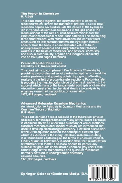 The suggestion that quantum-mechanical tunnelling might be a significant factor in some chemical reactions was first made fifty years ago by Hund, very soon after the principles of wave mechanics had been established by de Broglie, Schrodinger and Heisenberg, and similar ideas were put forward during the following thirty years by a number of authors. It was realised from the beginning that such effects would be particularly prominent in reactions involving the movement of protons or hydrogen atoms, and both theoretical and experimental work received a powerful stimulus in the discovery of deuterium in 1932. During the last twenty years theoretical predictions about the tunnel effect have been supported by an increasing body of experimental evidence, derived especially from studies of hydrogen isotope effects. The present book presents an attempt to summarize this evidence and to indicate the main lines of the basic theory. Details of mathematical manipu lation are restricted mainly to Chapter 2 and the Appendices, and many readers may prefer to confine themselves to the results obtained. The main emphasis has been on the kinetics of chemical reactions involving the transfer of protons, hydrogen atoms or hydride ions, although Chapter 6 gives an account of the role of the tunnel effect in molecular spectra, and Chapter 7 makes some mention of tunnelling in solid state phenomena, biological processes and the electrolytic discharge of hydrogen. Only passing references have been made to tunnelling by electrons.
