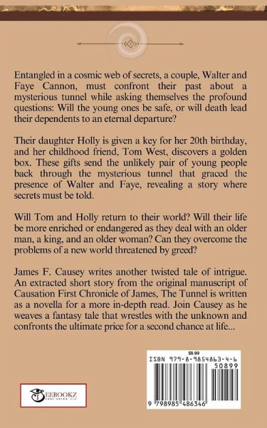 Entangled in a cosmic web of secrets, a couple, Walter and Faye Cannon, must confront their past about a mysterious tunnel while asking themselves the profound questions: Will the young ones be safe, or will death lead their dependents to an eternal departure? Their daughter Holly is given a key for her 20th birthday, and her childhood friend, Tom West, discovers a golden box. These gifts send the unlikely pair of young people back through the mysterious tunnel that graced the presence of Walter and Faye, revealing a story where secrets must be told. Will Tom and Holly return to their world? Will their life be more enriched or endangered as they deal with an older man, a king, and an older woman? Can they overcome the problems of a new world threatened by greed? James F. Causey writes another twisted tale of intrigue. An extracted short story from the original manuscript of Causation First Chronicle of James, The Tunnel is written for a more in-depth read. Join Causey as he weaves a fantasy tale that wrestles with the unknown and confronts the ultimate price for a second chance at life...