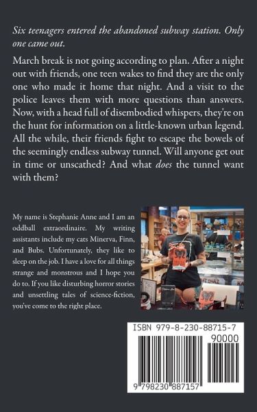Six teenagers entered the abandoned subway station. Only one came out. March break is not going according to plan. After a night out with friends, one teen wakes to find they are the only one who made it home that night. And a visit to the police leaves them with more questions than answers. Now, with a head full of disembodied whispers, they're on the hunt for information on a little-known urban legend. All the while, their friends fight to escape the bowels of the seemingly endless subway tunnel. Will anyone get out in time or unscathed? And what does the tunnel want with them?