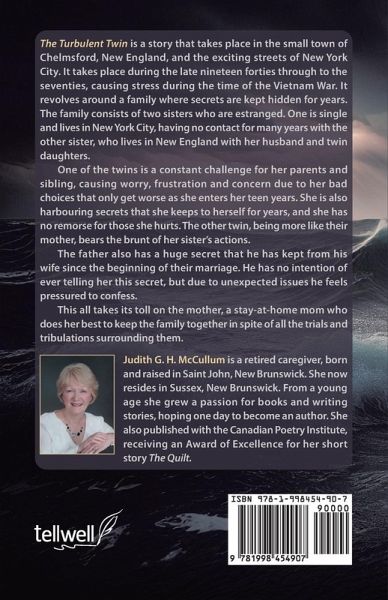 The Turbulent Twin is a story that takes place in the small town of Chelmsford, New England, and the exciting streets of New York City. IT takes place during the late nineteen forties through to the seventies, causing stress during the time of the Vietnam War. It revolves around a family where secrets are kept hidden for years. The family consists of two sisters who are estranged. One is single and lives in New York City, having no contact for many years with the other sister, who lives in New England with her husband and twin daughters. One of the twins is a constant challenge for her parents and sibling, causing worry, frustration and concern due to her bad choices that only get worse as she enters her teen years. She is also harbouring secrets that she keeps to herself for years, and she has no remorse for those she hurts. The other twin, being more like their mother, bears the brunt of her sister's actions. The father also has a huge secret that he has kept from his wife since the beginning of their marriage. He has no intention of ever telling her this secret, but due to unexpected issues he feels pressured to confess. This all takes its toll on the mother, a stay-at-home mom who does her best to keep the family together in spite of all the trials and tribulations surrounding them.