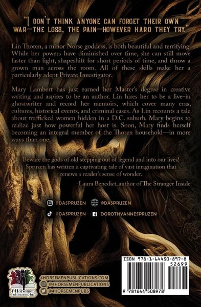 "I don't think anyone can forget their own war-the loss, the pain-however hard they try." Lin Thoren, a minor Norse goddess, is both beautiful and terrifying. While her powers have diminished over time, she can still move faster than light, shapeshift for short periods of time, and throw a grown man across the room. All of these skills make her a particularly adept Private Investigator. Mary Lambert has just earned her Master's degree in creative writing and aspires to be an author. Lin hires her to be a live-in ghostwriter and record her memoirs, which cover many eras, cultures, historical events, and criminal cases. As Lin recounts a tale about trafficked women hidden in a D.C. suburb, Mary begins to realize just how powerful her host is. Soon, Mary finds herself becoming an integral member of the Thoren household-in more ways than one.
