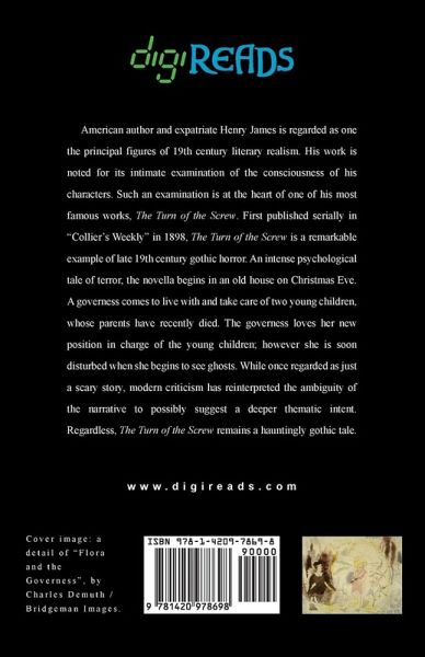 American author and expatriate Henry James is regarded as one the principal figures of 19th century literary realism. His work is noted for its intimate examination of the consciousness of his characters. Such an examination is at the heart of one of his most famous works, "The Turn of the Screw". First published serially in "Collier's Weekly" in 1898, "The Turn of the Screw" is a remarkable example of late 19th century gothic horror. An intense psychological tale of terror, the novella begins in an old house on Christmas Eve. A governess comes to live with and take care of two young children, whose parents have recently died. The governess loves her new position in charge of the young children; however she is soon disturbed when she begins to see ghosts. While once regarded as just a scary story, modern criticism has reinterpreted the ambiguity of the narrative to possibly suggest a deeper thematic intent. Regardless, "The Turn of the Screw" remains a hauntingly gothic tale. This edition is printed on premium acid-free paper.