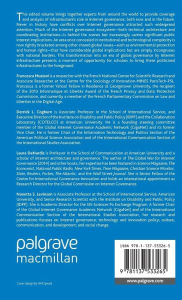 This edited volume brings together experts from around the world to provide coverage and analysis of infrastructure's role in Internet governance, both now and in the future. Never in history have conflicts over Internet governance attracted such widespread attention. High-profile controversies include the disclosures about NSA surveillance by intelligence analyst Edward Snowden, controversy over a decision by the US government to relinquish its historic oversight of Internet names and numbers, and countless cybersecurity breaches involving unauthorized access to Internet users' personal data. Much of the Internet governance ecosystem-both technical architecture and coordinating institutions-is behind the scenes but increasingly carries significant public interest implications. An area once concealed in institutional and technological complexity is now rightly bracketed among other shared global issues-such as environmental protection and human rights-that have considerable global implications but are simply incongruous with national borders. This transformation into an era of global governance by Internet infrastructure presents a moment of opportunity for scholars to bring these politicized infrastructures to the foreground.