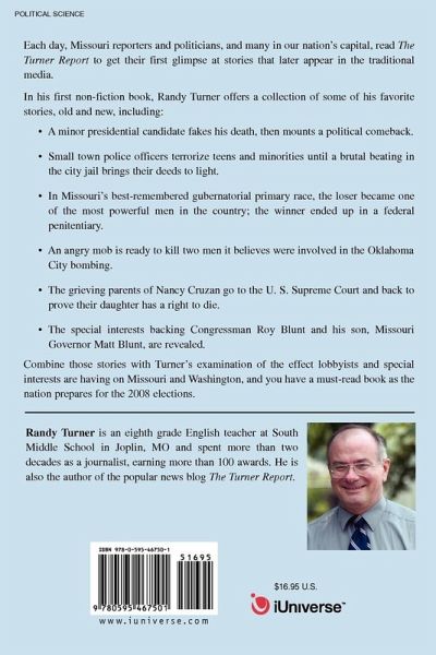 Each day, Missouri reporters and politicians, and many in our nation's capital, read The Turner Report to get their first glimpse at stories that later appear in the traditional media. In his first non-fiction book, Randy Turner offers a collection of some of his favorite stories, old and new, including: A minor presidential candidate fakes his death, then mounts a political comeback. Small town police officers terrorize teens and minorities until a brutal beating in the city jail brings their deeds to light. In Missouri's best-remembered gubernatorial primary race, the loser became one of the most powerful men in the country; the winner ended up in a federal penitentiary. An angry mob is ready to kill two men it believes were involved in the Oklahoma City bombing. The grieving parents of Nancy Cruzan go to the U. S. Supreme Court and back to prove their daughter has a right to die. The special interests backing Congressman Roy Blunt and his son, Missouri Governor Matt Blunt, are revealed. Combine those stories with Turner's examination of the effect lobbyists and special interests are having on Missouri and Washington, and you have a must-read book as the nation prepares for the 2008 elections.