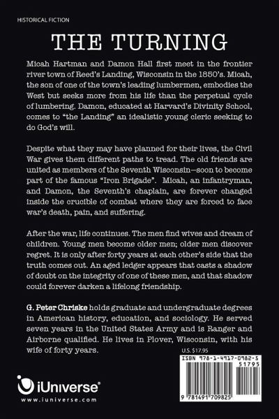 Micah Hartman and Damon Hall first meet in the frontier river town of Reed's Landing, Wisconsin in the 1850's. Micah, the son of one of the town's leading lumbermen, embodies the West but seeks more from his life than the perpetual cycle of lumbering. Damon, educated at Harvard's Divinity School, comes to "the Landing" an idealistic young cleric seeking to do God's will. Despite what they may have planned for their lives, the Civil War gives them different paths to tread. The old friends are united as members of the Seventh Wisconsin-soon to become part of the famous "Iron Brigade". Micah, an infantryman, and Damon, the Seventh's chaplain, are forever changed inside the crucible of combat where they are forced to face war's death, pain, and suffering. After the war, life continues. The men find wives and dream of children. Young men become older men; older men discover regret. It is only after forty years at each other's side that the truth comes out. An aged ledger appears that casts a shadow of doubt on the integrity of one of these men, and that shadow could forever darken a lifelong friendship.