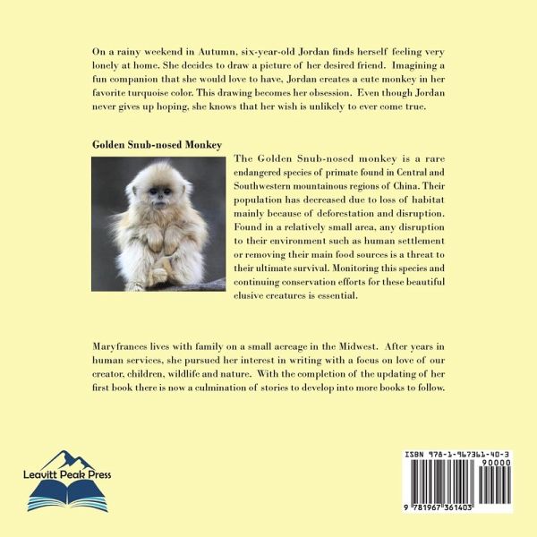 On a rainy weekend in Autumn, six-year-old Jordan finds herself feeling very lonely at home. She decides to draw a picture of her desired friend. Imagining a fun companion that she would love to have, Jordan creates a cute monkey in her favorite turquoise color. This drawing becomes her obsession. Even though Jordan never gives up hoping, she knows that her wish is unlikely to ever come true. Golden Snub-nosed Monkey The Golden Snub-nosed monkey is a rare endangered species of primate found in Central and Southwestern mountainous regions of China. Their population has decreased due to loss of habitat mainly because of deforestation and disruption. Found in a relatively small area, any disruption to their environment such as human settlement or removing their main food sources is a threat to their ultimate survival. Monitoring this species and continuing conservation efforts for these beautiful elusive creatures is essential.