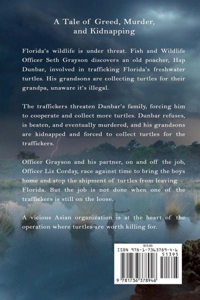 Inspired by actual events in Lee County Florida. A Tale of Greed, Murder, and Kidnapping Florida's wildlife is under threat. Fish and Wildlife Officer Seth Grayson discovers an old poacher, Hap Dunbar, involved in trafficking Florida's freshwater turtles. His grandsons are collecting turtles for their grandpa, unaware it's illegal. The traffickers threaten Dunbar's family, forcing him to cooperate and collect more turtles. Dunbar refuses, is beaten, and eventually murdered, and his grandsons are kidnapped and forced to collect turtles for the traffickers. Officer Grayson and his partner, on and off the job, Officer Liz Corday, race against time to bring the boys home and stop the shipment of turtles from leaving Florida. But the job is not done when one of the traffickers is still on the loose. A vicious Asian organization is at the heart of the operation where turtles are worth killing for.
