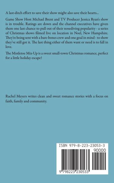 A last-ditch effort to save their show might also save their hearts... Game Show Host Michael Brent and TV Producer Jessica Ryan's show is in trouble. Ratings are down and the channel executives have given them one last chance to pull out of their nosediving popularity - a series of Christmas shows filmed live on location in Noel, New Hampshire. They're being sent with a bare-bones crew and one goal in mind - to show they've still got it. The last thing either of them want or need is to fall in love. The Mistletoe Mix-Up is a sweet small-town Christmas romance, perfect for a little holiday escape!