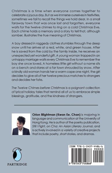 Christmas is a time when everyone comes together to celebrate a joyous day. But as we immerse ourselves in festivities, sometimes we fail to recall the things we hold dear. In a small faraway town that was once lost and forgotten, everyone waits for the twelve chimes to ring on a cold Christmas Eve. Each chime holds a memory and a story to tell that, although somber, illustrates the true meaning of Christmas. A boy dressed in raggedy clothes stumbles through the deep snow until he arrives at a red, white, and green house. After he is saved from the cold by the family inside, he receives an unexpected yet wonderful gift. A young woman trapped in an unhappy marriage waits every Christmas Eve to remember the boy she once loved. A homeless little girl without a name sits on a bench and stares at a far town shrouded by snow. After a kindly old woman hands her a warm cape one night, the girl decides to give all of her twelve precious matches to strangers and decides her fate. The Twelve Chimes before Christmas is a poignant collection of lyrical holiday tales that remind all of us to embrace simple blessings, gratitude, and the kindness of strangers.