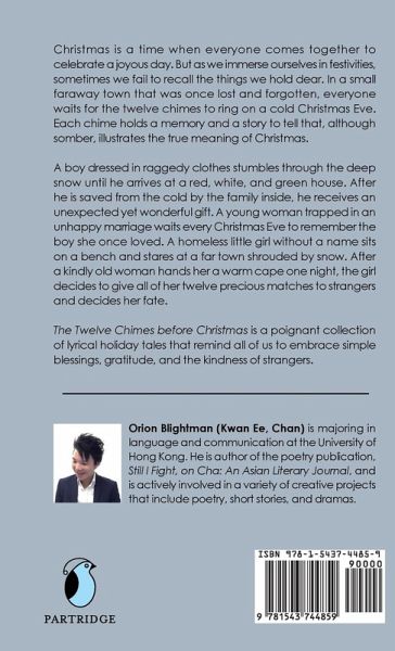 Christmas is a time when everyone comes together to celebrate a joyous day. But as we immerse ourselves in festivities, sometimes we fail to recall the things we hold dear. In a small faraway town that was once lost and forgotten, everyone waits for the twelve chimes to ring on a cold Christmas Eve. Each chime holds a memory and a story to tell that, although somber, illustrates the true meaning of Christmas. A boy dressed in raggedy clothes stumbles through the deep snow until he arrives at a red, white, and green house. After he is saved from the cold by the family inside, he receives an unexpected yet wonderful gift. A young woman trapped in an unhappy marriage waits every Christmas Eve to remember the boy she once loved. A homeless little girl without a name sits on a bench and stares at a far town shrouded by snow. After a kindly old woman hands her a warm cape one night, the girl decides to give all of her twelve precious matches to strangers and decides her fate. The Twelve Chimes before Christmas is a poignant collection of lyrical holiday tales that remind all of us to embrace simple blessings, gratitude, and the kindness of strangers.