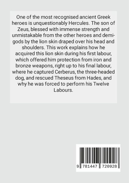 One of the most recognised ancient Greek heroes is unquestionably Hercules. The son of Zeus, blessed with immense strength and unmistakable from the other heroes and demi-gods by the lion skin draped over his head and shoulders. This work explains how he acquired this lion skin during his first labour, which offered him protection from iron and bronze weapons, right up to his final labour, where he captured Cerberus, the three-headed dog, and rescued Theseus from Hades, and why he was forced to perform his Twelve Labours.