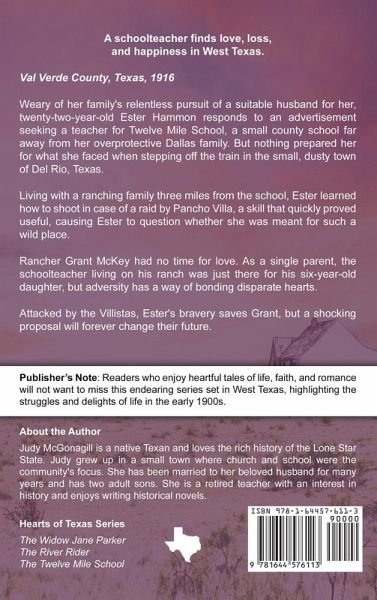 A schoolteacher finds love, loss, and happiness in West Texas. Val Verde County, Texas, 1916 Weary of her family's relentless pursuit of a suitable husband for her, twenty-two-year-old Ester Hammon responds to an advertisement seeking a teacher for Twelve Mile School, a small county school far away from her overprotective Dallas family. But nothing prepared her for what she faced when stepping off the train in the small, dusty town of Del Rio, Texas. Living with a ranching family three miles from the school, Ester learned how to shoot in case of a raid by Pancho Villa, a skill that quickly proved useful, causing Ester to question whether she was meant for such a wild place. Rancher Grant McKey had no time for love. As a single parent, the schoolteacher living on his ranch was just there for his six-year-old daughter, but adversity has a way of bonding disparate hearts. Attacked by the Villistas, Ester's bravery saves Grant, but a shocking proposal will forever change their future. Publisher's Note: Readers who enjoy heartful tales of life, faith, and romance will not want to miss this endearing series set in West Texas, highlighting the struggles and delights of life in the early 1900s. Hearts of Texas Series The Widow Jane Parker The River Rider The Twelve Mile School
