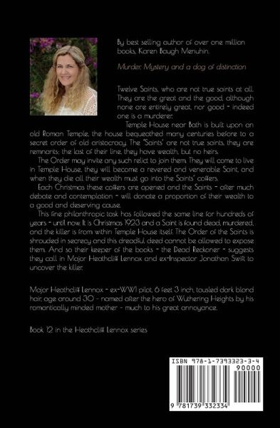 Murder, mystery and a dog of distinction. Heathcliff Lennox investigates. Book 12 in the Heathcliff Lennox series Twelve Saints, who are not true saints at all. They are the great and the good, although none are entirely great, nor good - indeed one is a murderer. Temple House near Bath is built upon an old Roman Temple, the house bequeathed many centuries before to a secret order of old aristocracy. The 'Saints' are not true saints, they are remnants; the last of their line, they have wealth, but no heirs. The Order may invite any such relict to join them. They will come to live in Temple House, they will become a revered and venerable Saint, and when they die all their wealth must go into the saints coffers. Each Christmas these coffers are opened and the Saints - after much debate and contemplation - will donate a proportion of their wealth to a good and deserving cause. This fine philanthropic task has followed the same line for hundreds of years - until now. It is Christmas 1923 and a Saint is found dead, murdered, and the killer is from within Temple House itself. The Order of the Saints is shrouded in secrecy and this dreadful deed cannot be allowed to expose them. And so their keeper of the books - the Dead Reckoner - suggests they call in Major Heathcliff Lennox and ex-Inspector Jonathan Swift to uncover the killer. Major Heathcliff Lennox - ex WW1 war pilot, 6feet 3inch, tousled dark blond hair, age around 30 - named after the hero of Wuthering Heights by his romantically minded mother - much to his great annoyance.