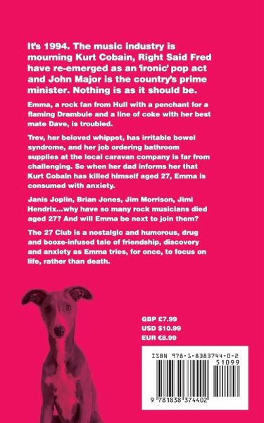 It's 1994. The music industry is mourning Kurt Cobain, Right Said Fred have re-emerged as an 'ironic' pop act and John Major is the country's prime minister. Nothing is as it should be. Emma, a working-class rock music fan from Hull, with a penchant for a flaming Drambuie and a line of coke with her best mate Dave down The Angel, is troubled. Trev, her beloved whippet, has doggy IBS, and her job ordering bathroom supplies at the local caravan company is far from challenging. So when her dad, Tel, informs her that Kurt Cobain has killed himself aged 27, Emma is consumed with anxiety. Janis Joplin, Brian Jones, Jim Morrison, Jimi Hendrix...why have so many rock musicians died aged 27? And will Emma be next to join The Twenty Seven Club? The Twenty Seven Club is a nostalgic, often humorous, drug and booze-infused tale of friendship, discovery and anxiety as Emma tries, for once, to focus on life, rather than death.