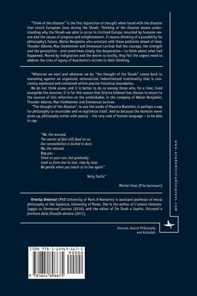 ¿Think of the disaster¿ is the first injunction of thought when faced with the disaster that struck European Jews during the Shoah. Thinking of the disaster means understanding why the Shoah was able to occur in civilized Europe, moulded by humane reason and the values of progress and enlightenment. It means thinking of a possibility for philosophy¿s future. Walter Benjamin, who wrestled with these problems ahead of time, Theodor Adorno, Max Horkheimer, and Emmanuel Levinas had the courage, the strength and the perception¿and sometimes simply the desperation¿to think about what had happened. Moved by indignation and the desire to testify, they felt the urgent need to address the cries of agony of Auschwitz¿s victims in their thinking.