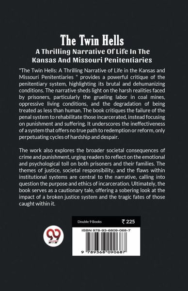 "The Twin Hells: A Thrilling Narrative of Life in the Kansas and Missouri Penitentiaries " provides a powerful critique of the penitentiary system, highlighting its brutal and dehumanizing conditions. The narrative sheds light on the harsh realities faced by prisoners, particularly the grueling labor in coal mines, oppressive living conditions, and the degradation of being treated as less than human. The book critiques the failure of the penal system to rehabilitate those incarcerated, instead focusing on punishment and suffering. It underscores the ineffectiveness of a system that offers no true path to redemption or reform, only perpetuating cycles of hardship and despair. The work also explores the broader societal consequences of crime and punishment, urging readers to reflect on the emotional and psychological toll on both prisoners and their families. The themes of justice, societal responsibility, and the flaws within institutional systems are central to the narrative, calling into question the purpose and ethics of incarceration. Ultimately, the book serves as a cautionary tale, offering a sobering look at the impact of a broken justice system and the tragic fates of those caught within it.