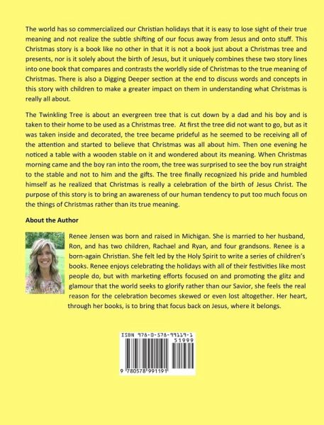 The Twinkling Tree is about an evergreen tree that is cut down by a dad and his boy and is taken to their home to be used as a Christmas tree. At first, the tree did not want to go, but as it was taken inside and decorated, the tree became prideful as he seemed to be receiving all of the attention and started to believe that Christmas was all about him. Then one evening he noticed a table with a wooden stable on it and wondered about its meaning. When Christmas morning came and the boy ran into the room, the tree was surprised to see the boy run straight to the stable and not to him and the gifts. The tree finally recognized his pride and humbled himself as he realized that Christmas is really a celebration of the birth of Jesus Christ. The purpose of this story is to bring an awareness of our human tendency to put too much focus on the things of Christmas rather than its true meaning.