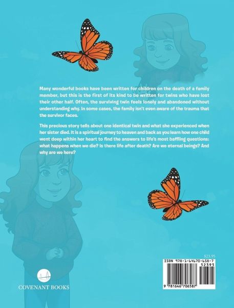 Many wonderful books have been written for children on the death of a family member, but this is the first of its kind to be written for twins who have lost their other half. Often, the surviving twin feels lonely and abandoned without understanding why. In some cases, the family isn't even aware of the trauma that the survivor faces. This precious story tells about one identical twin and what she experienced when her sister died. It is a spiritual journey to heaven and back as you learn how one child went deep within her heart to find the answers to life's most baffling questions: what happens when we die? Is there life after death? Are we eternal beings? And why are we here?