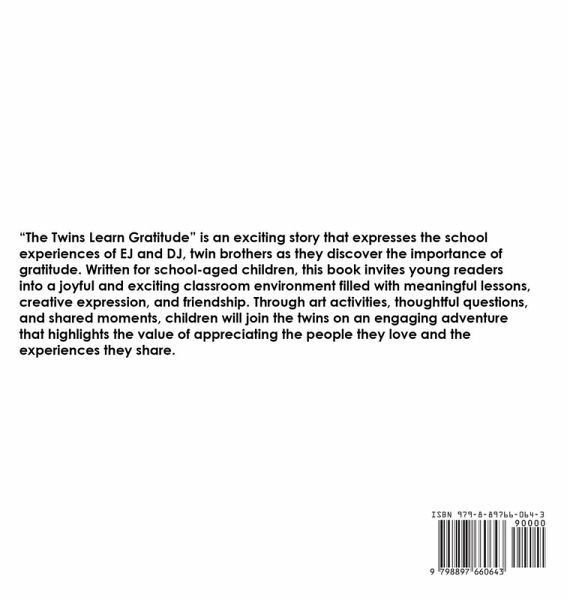 "The Twins Learn Gratitude" is an exciting story that expresses the school experiences of EJ and DJ, twin brothers, as they discover the importance of gratitude. Written for school-aged children, this book invites young readers into a joyful and exciting classroom environment filled with meaningful lessons, creative expression, and friendship. Through art activities, thoughtful questions, and shared moments, children will join the twins on an engaging adventure that highlights the value of appreciating the people they love and the experiences they share.
