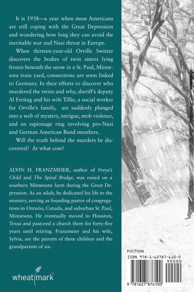 It is 1938 -- a year when most Americans are still coping with the Great Depression and wondering how long they can avoid the inevitable war and Nazi threat in Europe. When thirteen-year-old Orville Switzer discovers the bodies of twin sisters lying frozen beneath the snow in a St. Paul, Minnesota train yard, connections are soon linked to Germany. In their efforts to discover who murdered the twins and why, sheriff's deputy Al Freitag and his wife Tillie, a social worker for Orville's family, are suddenly plunged into a web of mystery, intrigue, mob violence, and an espionage ring involving pro-Nazi and German American Bund members. Will the truth behind the murders be discovered? At what cost?