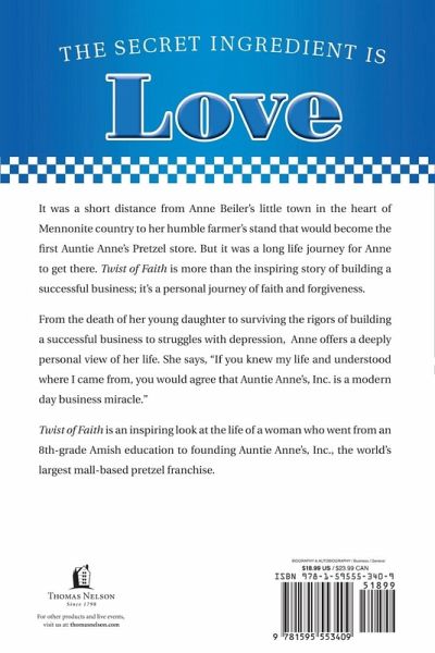 The secret ingredient is love. It was a short distance from Anne Beiler's little town in the heart of Mennonite country to her humble farmer's stand that would become the first Auntie Anne's Pretzel store. But it was a long life journey for Anne to get there. Twist of Faith is more than the inspiring story of building a successful business; it's a personal journey of faith and forgiveness. From the death of her young daughter to surviving the rigors of building a successful business to struggles with depression, Anne offers a deeply personal view of her life. She says, "If you knew my life and understood where I came from, you would agree that Auntie Anne's, Inc. is a modern day business miracle." Twist of Faith is an inspiring look at the life of a woman who went from an 8th-grade Amish education to founding Auntie Anne's, Inc., the world's largest mall-based pretzel franchise.