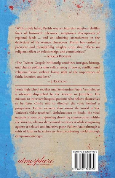 READERS' FAVORITE BOOK AWARD - Finalist, Christian Fiction READERS' CHOICE BOOK AWARD - Finalist, Best Adult Book NEXT GENERATION INDIE BOOK AWARDS - Finalist, Religious Fiction "With a deft hand, Parish weaves into this religious thriller facts of historical relevance, sumptuous descriptions of regional foods ... and an admiring attentiveness in the depictions of his women characters. Parish has crafted a prescient and thoughtfully weighty story that reflects on religion's effect on relationships and communities." - Kirkus Reviews "A must read for fans of thrillers, or anyone interested in faith and the balance of power and integrity."- Readers' Choice 5-Star Review "The Twitter Gospels is a realistic Christian novel that takes readers on an invigorating journey of questions and discovery. Beautifully written with crisp imagery and vivid descriptions ... the story is a religious thriller with a fascinating plot and an even more interesting protagonist." - Readers' Favorite Book Review Jesuit high school teacher, seminarian, and expert on religious fanaticism Paolo Venticinque is abruptly dispatched by the Vatican from his teaching job in Florence to Jerusalem. His mission is to interview hospital patients who believe themselves to be Jesus Christ and to discover the voice behind a Twitter account that preaches a progressive gospel while warning the world of the Vatican's "false teachers". Unbeknownst to Paolo, the viral account is seen as a growing threat by conservatives within the Vatican, who are determined to silence it while conspiring against a beloved and inclusive pope. Follow Paolo through a crisis of faith as he strives to view a confusing world through compassionate eyes, while unraveling the mystery.