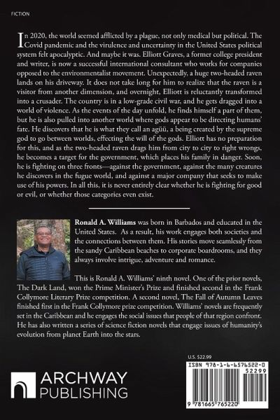 In 2020, the world seemed afflicted by a plague, not only medical but political. The Covid pandemic and the virulence and uncertainty in the United States political system felt apocalyptic. And maybe it was. Elliott Graves, a former college president and writer, is now a successful international consultant who works for companies opposed to the environmentalist movement. Unexpectedly, a huge two-headed raven lands on his driveway. It does not take long for him to realize that the raven is a visitor from another dimension, and overnight, Elliott is reluctantly transformed into a crusader. The country is in a low-grade civil war, and he gets dragged into a world of violence. As the events of the day unfold, he finds himself a part of them, but he is also pulled into another world where gods appear to be directing humans' fate. He discovers that he is what they call an aguu, a being created by the supreme god to go between worlds, effecting the will of the gods. Elliott has no preparation for this, and as the two-headed raven drags him from city to city to right wrongs, he becomes a target for the government, which places his family in danger. Soon, he is fighting on three fronts-against the government, against the many creatures he discovers in the fugue world, and against a major company that seeks to make use of his powers. In all this, it is never entirely clear whether he is fighting for good or evil, or whether those categories even exist.