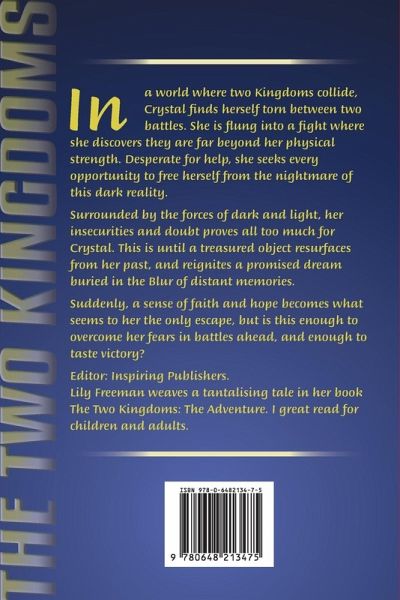 In a world where two Kingdoms collide, Crystal finds herself torn between two battles. She is flung into a fight where she discovers they are far beyond her physical strength. Desperate for help, she seeks every opportunity to free herself from the nightmare of this dark reality. Surrounded by the forces of dark and light, her insecurities and doubt proves all too much for Crystal. This is until a treasured object resurfaces from her past, and reignites a promised dream buried in the Blur of distant memories. Suddenly, a sense of faith and hope becomes what seems to her the only escape, but is this enough to overcome her fears in battles ahead, and enough to taste victory? Editor: Inspiring Publishers. Lily Freeman weaves a tantalising tale in her book The Two Kingdoms: The Adventure. I great read for children and adults.