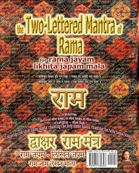 These journals are for doing the Written-Japa of the Rama-Mantras. Rama-Japa--the constant repetition of the Rama Mantras--is usually done mentally, or on a rosary; but there is one extremely efficacious method of this Japa: the Likhita-Japa. The practice of writing the Rama Mantra over and over on paper is called the Likhita-Japa, and this Journal is dedicated to the Written-Japa of the Two-Lettered Mantra of Lord Rama. The written form of Japa is a lasting record of chant, remaining ever imbued with those holy vibrations, for all times, for the benefit of writer and the future generations. Once embellished with your Mantras, this Journal will become a priceless treasure which you can gift to your loved ones—an unparalleled gift of love, labor, caring, wishing, and above all——Devotion. A brief introduction of the Mantra is given and it is repeated on every page so you can replicate it. Please check out the other Journal in this Series which are dedicated to other Rama-Mantras--from the 1-Lettered to 32-Lettered and others. Besides this series, also available are Journals in the following 2 Series: 1. Rama Jayam - Likhita Japam Mala alongside Sacred Hindu Texts (several) -- are Journals for performing the 100,000 Rama-Nama Likhita Japa alongside Sacred Texts like: Hanuman Chalisa, Nama Ramayanam, Rama-Ashtottara-Shata-Nama-Valih, Rama-Ashtottara-Shata-Nama-Stotra, Rama Raksha Stotra, Ramashtakam… (all available with more on the way) 2. Tulsi-Ramayana Rama-Nama Mala (in multiple volumes): Legacy Journals for Writing the Rama Name alongside Full Tulsi Ramayana, are legacy Journals in which you can write down your spiritual sentiments, and the Rama-Nama, alongside the printed Tulsi Ramayana. These Journal-Books contain the original text, transliteration, translation, and space for you to jot down your thoughts and write the Rama-Nama. Pages also have inspirational words of Hindu Saint to help guide aspirants on their spiritual journey. You can embellish the entire Tulsi Ramayana with your Rama-Namas and gift them to your loved ones--a truly unique gift of love, care, labor, and devotion. (Volumes will be released progressively)