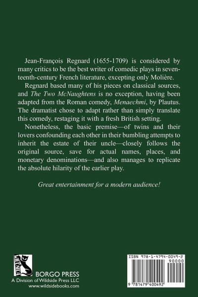 Jean-François Regnard (1655-1709) is considered by many critics to be the best writer of comedic plays in seventeenth-century French literature, excepting only Molière. Regnard based many of his pieces on classical sources, and THE TWO MCNAUGHTENS is no exception, having been adapted from the Roman comedy, Menaechmi, by Plautus. The dramatist chose to adapt rather than simply translate this comedy, restaging it with a fresh British setting. Nonetheless, the basic premise--of twins and their lovers confounding each other in their bumbling attempts to inherit the estate of their uncle--closely follows the original source, save for actual names, places, and monetary denominations--and also manages to replicate the absolute hilarity of the earlier play. Great entertainment for a modern audience!