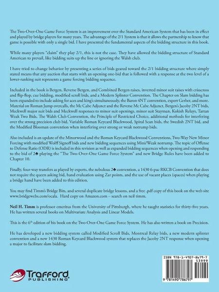 The Two-Over-One Game Force System is an improvement over the Standard American System that has been in effect and played by bridge players for many years. The advantage of the 2/1 System is that it allows the partnership to know that game is possible with only a single bid. I have presented the fundamental aspects of the bidding structure in this book. While many players claim they play 2/1, this is not the case. They have allowed the bidding structure of Standard American to prevail, like bidding suits up the line or ignoring the Walsh club. I have tried to change behavior by presenting a series of bids geared toward the 2/1 bidding structure where simply stated means that any auction that starts with an opening one-bid that is followed with a response at the two level of a lower-ranking suit represents a game forcing bidding sequence. Included in the book is Bergen, Reverse Bergen, and Combined Bergen raises, inverted minor suit raises with crisscross and flip-flop, cue bidding, modified scroll bids, and a Modern Splinter Convention. The Chapter on Slam bidding has been expanded to include asking for aces and kings simultaneously, the Baron 4NT convention, expert Gerber, and more. Material on Roman Jump overcalls, the Mc Cabe Adjunct and the Reverse Mc Cabe Adjunct, Bergens Jacoby 2NT bids, Meckwell major suit bids and Meckwell responses to minor suit openings, minor suit Stayman, Kokish Relays, Tartan Weak Two Bids, The Walsh Club Convention, the Principle of Restricted Choice, additional methods for interfering over the strong precision club bid, Variable Roman Keycard Blackwood, Spiral Scan bids, the Swedish 2NT bid, and the Modified Blooman convention when interfering over strong or weak notrump bids. Also included is an update of the Minorwood and the Roman Keycard Blackwood Conventions, Two-Way New Minor Forcing with modified Wolff Signoff bids and new bidding sequences using Mini/Weak notrump. The topic of Offense to Defense Ratio (ODR) is included in this revision as well as expanded bidding sequences when opening and responding to the bid of 2 playing the The Two-Over-One Game Force System and new Bridge Rules have been added to Chapter 10. Finally, four-way transfers as played by experts, the nebulous 2 convention, a 1430 6-pac RKCB Convention that does not require the queen asking bid, hand evaluation using Zar points, and the use of vacant places (spaces) when playing a bridge hand have been added to this edition. You may find Timms Bridge Bits, and several duplicate bridge lessons, and a free .pdf copy of this book on the web site www.bridgewebs.com/ocala. Hard copy on Amazon.com search on neil timm. Neil H. Timm is professor emeritus from the University of Pittsburgh, where he taught statistics for thirty-five years. He has written several books on Multivariate Analysis and Linear Models. This is the 6th edition of his book on the Two-Over-One Game Force System. He has also written a book on Precision. He has developed a new bidding system called Modified Scroll Bids, Montreal Relay bids, a new modern splinter convention and a new 1430 Roman Keycard Blackwood system that replaces the Jacoby 2NT response when opening a major to facilitate slam bidding.
