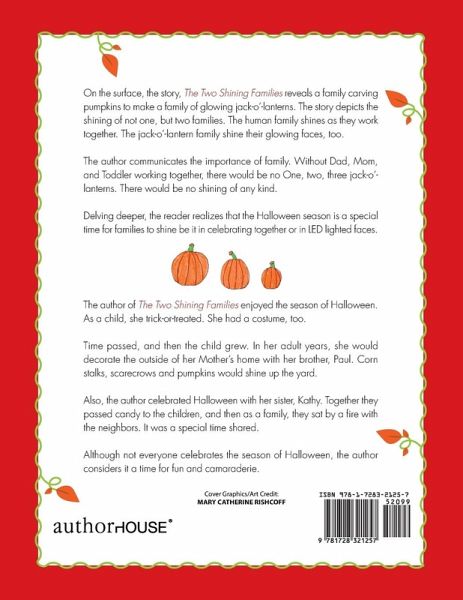 On the surface, the story, The Two Shining Families reveals a family carving pumpkins to make a family of glowing jack-o-lanterns. The story depicts the shining of not one, but two families. The human family shines as they work together. The jack-o-lantern family shine their glowing faces, too. The author communicates the importance of family. Without Dad, Mom, and Toddler working together, there would be no One, two, three jack-o-lanterns. There would be no shining of any kind. Delving deeper, the reader realizes that the Halloween season is a special time for families to shine be it in celebrating together or in LED lighted faces.