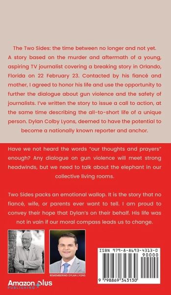 The Two Sides: the time between no longer and not yet. A story based on the murder and aftermath of a young, aspiring TV journalist covering a breaking story in Orlando, Florida on 22 February 23. Contacted by his fiancé and mother, I agreed to honor his life and use the opportunity to further the dialogue about gun violence and the safety of journalists. I've written the story to issue a call to action, at the same time describing the all-to-short life of a unique person. Dylan Colby Lyons, deemed to have the potential to become a nationally known reporter and anchor. Have we not heard the words "our thoughts and prayers" enough? Any dialogue on gun violence will meet strong headwinds, but we need to talk about the elephant in our collective living rooms. Two Sides packs an emotional wallap. It is the story that no fiancé, wife, or parents ever want to tell. I am proud to convey their hope that Dylan's on their behalf. His life was not in vain if our moral compass leads us to change.