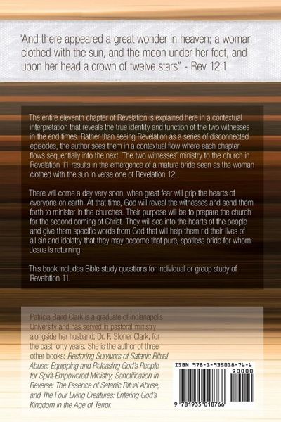 The entire eleventh chapter of Revelation is explained here in a contextual interpretation that reveals the true identity and function of the two witnesses in the end times. Rather than seeing Revelation as a series of disconnected episodes, the author sees them in a contextual flow where each chapter flows sequentially into the next. The two witnesses' ministry to the church in Revelation 11 results in the emergence of a mature bride seen as the woman clothed with the sun in verse one of Revelation 12. There will come a day very soon, when great fear will grip the hearts of everyone on earth. At that time, God will reveal the witnesses and send them forth to minister in the churches. Their purpose will be to prepare the church for the second coming of Christ. They will see into the hearts of the people and give them specific words from God that will help them rid their lives of all sin and idolatry that they may become that pure, spotless bride for whom Jesus is returning