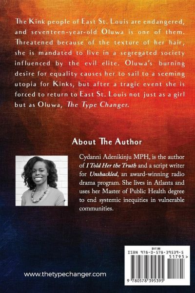 A type changer is a person who uses empathy to create positive change. Long ago, unseen beings placed a curse of division on humanity because of ancestors making a pact with an evil sea creature. Now the worth of a person's life is determined by the texture of their natural hair. Kink people with 4C hair like female protagonist Oluwa, are marginalized from civic life, left to endure health disparities and social injustice while living in East St. Louis. After a tragic event, Oluwa soon discovers she has the cure for texturism, as she is chosen to break humanity's curse. But first she must undergo a life altering process which will change her appearance putting her life and the ones she loves at risk.