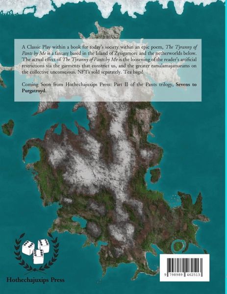 A Classic Play within a book for today's society within an epic poem, The Tyranny of Pants by Me is a fantasy based in the Island of Zysigamore and in the netherworlds below. The actual effect of The Tyranny of Pants by Me is the loosening of the reader's artificial restrictions via the garments that constrict us, and the greater ramalamajamarams on the collective unconscious.